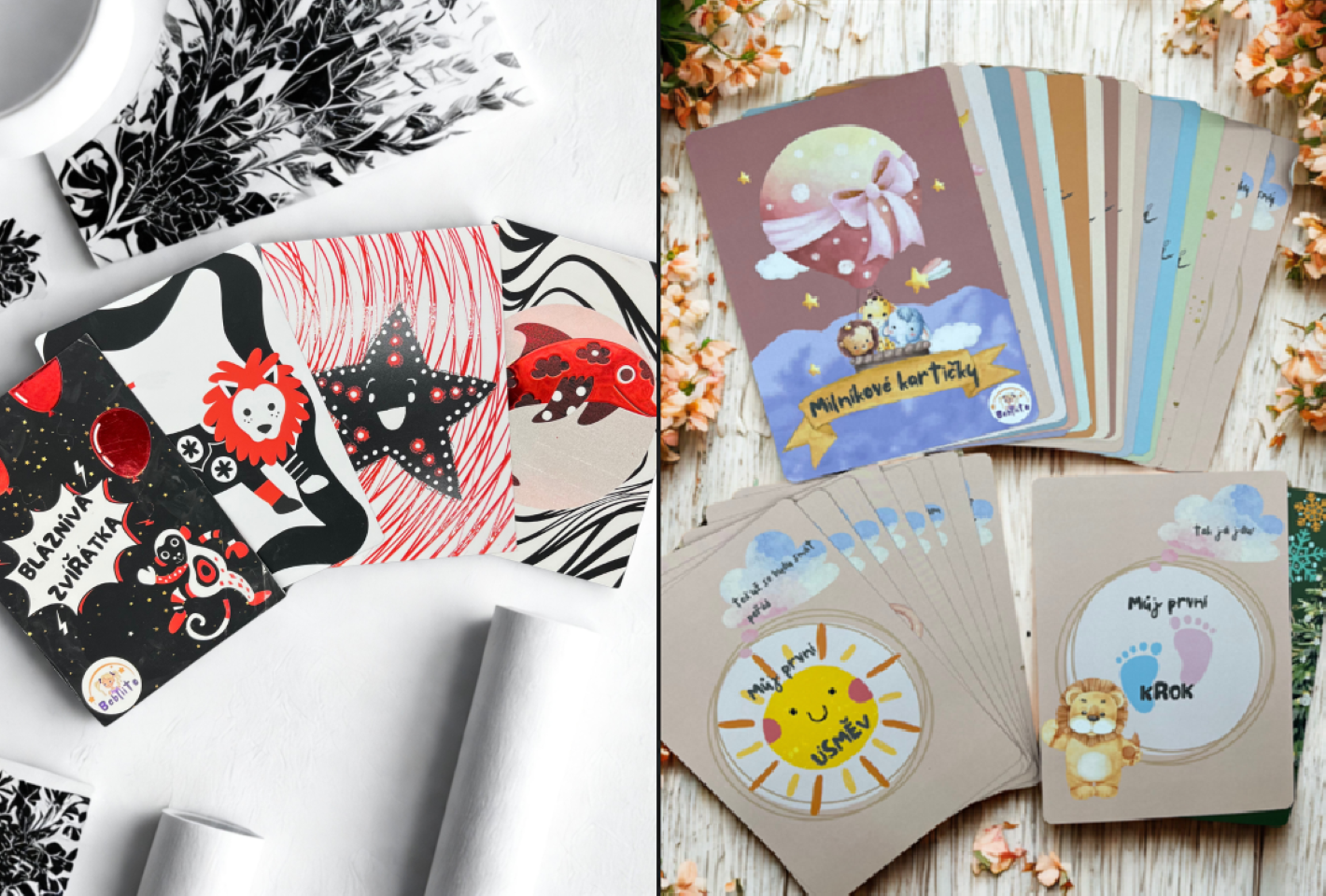 Naše kontrastní a vzdělávací kartičky rozvíjejí dětský zrak, fantazii i zvídavost, zatímco milníkové karty a personalizovaná fotoalba pomáhají rodičům uchovat nejcennější vzpomínky.